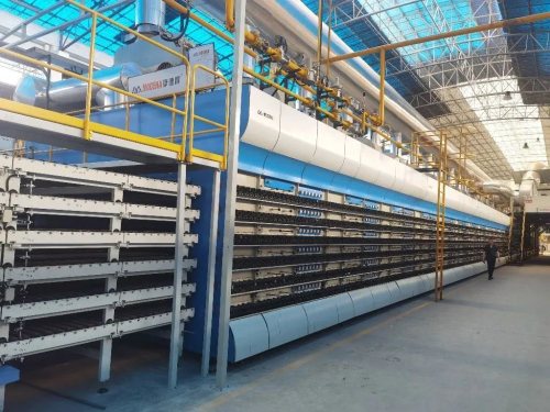 本次合作選用的是兩條摩德娜MRD-HB6系列多層自循環干燥窯(L=115.5M)及MDS系列節能高效寬體窯(L=556.5M)米,線速度35米/分鐘,主要產品規格為400x800mm,最低日產量十萬平方米!在保證質量和兼顧大產量的雙重要求下,整個項目從設計、材料、制造、安裝以及調試無疑是行業裝備的又一次極限升級!該項目配置先進的數智化生產線及窯爐燃燒系統和智能溫控管理軟件,科學分析坯體表面強度和氧化速度設計合理的燒成曲線,計算合理的窯爐空間高度,保證煙氣合適的流動速度,加快煙氣對坯體的熱交換能力。