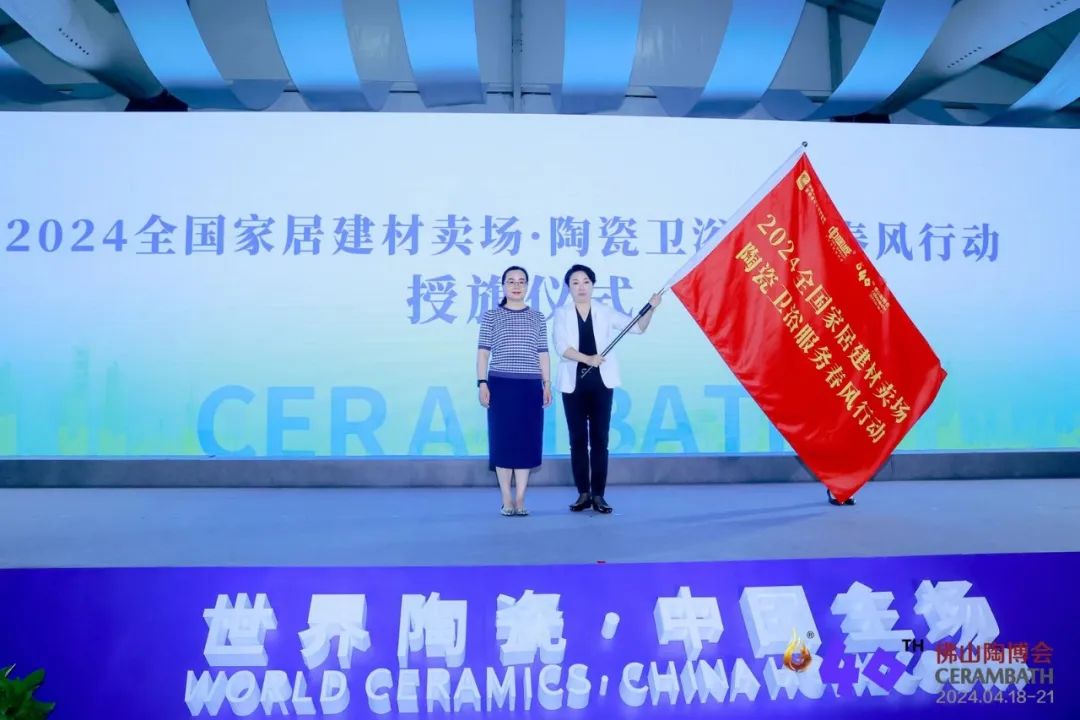 為進一步助力經銷商轉型升級與發展,提供更加優質與系統性服務,佛山陶博會與中國建筑材料流通協會家居市場專委會聯手,推出“2024全國家居建材賣場·陶瓷衛浴服務春風行動”。在開幕式現場,中國建筑材料流通協會副會長兼常務秘書長、家居建材市場專委會主席張彩虹向佛山中陶城集團副總裁、中國陶瓷衛浴總部總經理、中國淄博陶瓷總部總經理湯潔明授予旗幟。
